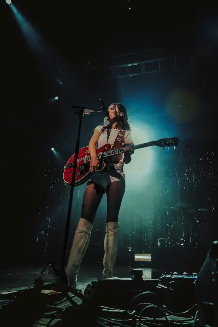 The show began in near darkness, with a single light casting Ellie Rowsell in silhouette as she delivered the haunting opener “Thorns.” It was an arresting image—her voice floating above the hush of the room, fragile yet commanding. Then, grabbing her Gretsch Super Chet guitar, she launched the band into motion, and the fun truly began as the disco ball started it’s marathon of orbits.